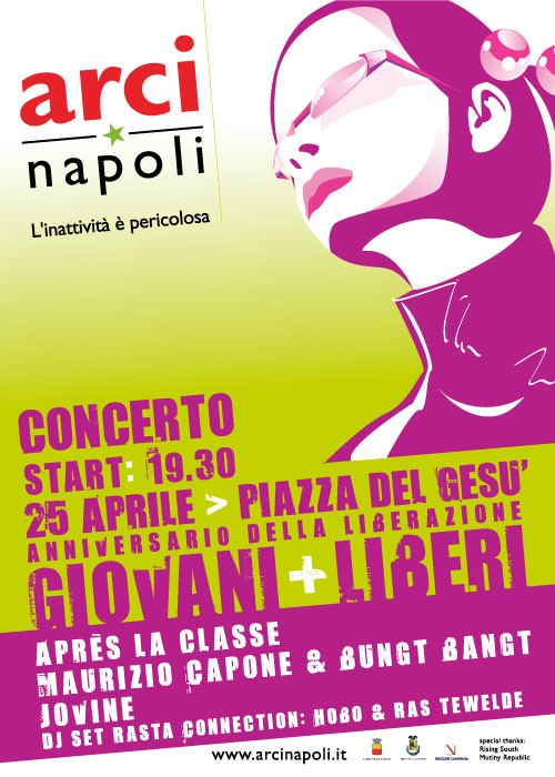 L'Arci Napoli dedica il 61esimo anniversario della Liberazione ai giovani con una manifestazione artistica centrata sul concerto che si terrà in piazza del Gesù Nuovo a Napoli il 25 aprile dalle 19:30 La kermesse è intitolata "giovani + liberi" volendo appunto evocare il valore della libertà e della forza liberatrice dei giovani di una citta\ che, per il ruolo dei suoi cittadini nella Resistenza, è stata insignita della medaglia d'oro per il valor civile. Tra gli artisti: Apres La Classe, Maurizio Capone & Bungt Bangt e Jovine, presenta Lino D'Angiò. / |